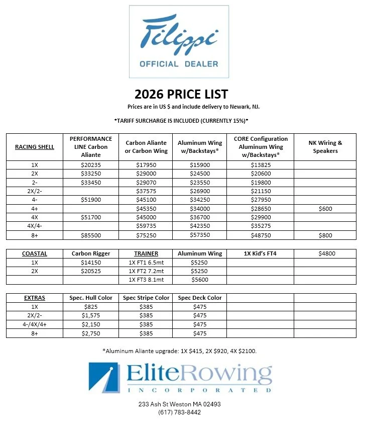 Pricing includes all costs to get your new Filippi boat from Italy to Newark, NJ, pending any new tariffs.